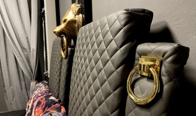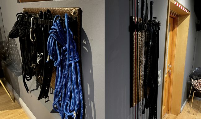 Der Bettraum ist mehr als ein Schlafzimmer. Deswegen heisst er auch nicht so. Hier könnt ihr euch nämlich erst austoben und später dann ausruhen. Das Himmelbett ist aus solidem Stahl gebaut und wiegt ca eine halbe Tonne. Gut, ihr sollt es ja nicht heben! Aber vielleicht darin schweben – ob in anderen Sphären oder an Seilen. Dafür sind im oberen Bereich feste Ösen verbaut. Es lässt sich außerdem an drei Seiten mit der Double Penetration HighSmyth F!ckmaschine erweitern und das Lederlaken, dass ihr abends gegen einen kuscheligen Bezug austauschen könnt, hält einiges aus. Wer es gern rutschig mag, für den liegt eine Spezialauflage mit erhöhtem Rand bereit. Für fesselnde Erlebnisse sind praktische Airlineschienen sowie weitere Aufnahmen am Kopfende verbaut. Das optionale Ambientlight, der deckenhohe Spiegel und der massive Löwenkopf sorgen für eine ganz besondere Atmosphäre. Und ob ihr bei eurem Treiben ein paar heiße Videos laufen lassen wollt oder lieber die Sportschau, ein Fernseher samt DVD-Player ist vorhanden. Eine kleine Auswahl an Schlagwerkzeugen und Fesselndem natürlich auch!