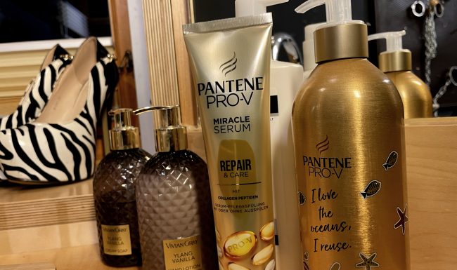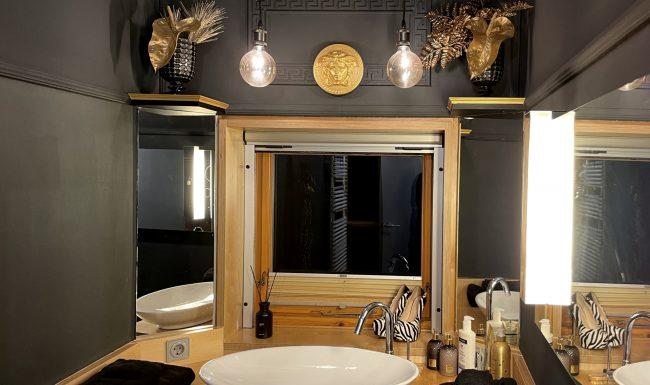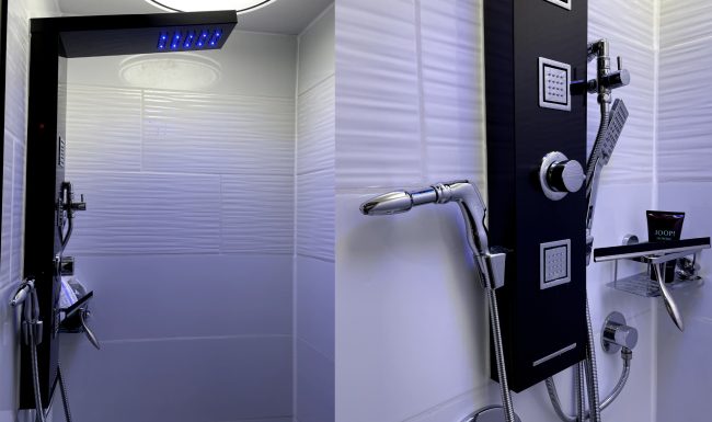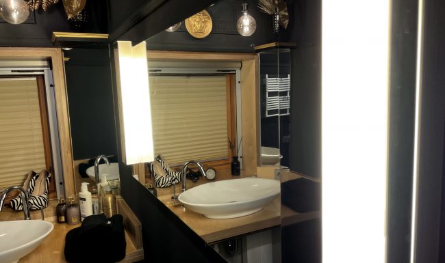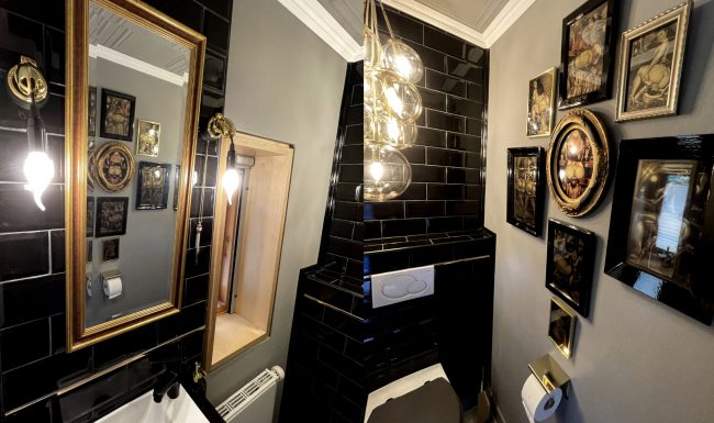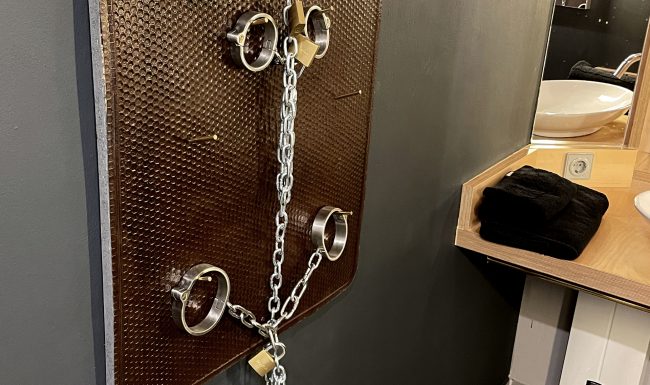 Oder besser DIE Nassräume. Es gibt ein Duschbad und ein seperates WC. Beide sind mit viel Liebe eingerichtet. So finden sich im WC Wandlampen aus goldenen Peniskäfigen und Bildmotive die „irgendwie gut zum Geschäft“ passen – ohne dabei vordergründig vulgär zu sein.