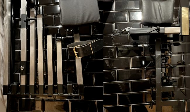 Auch der Bock aus Stahl und Leder bietet viele Optionen. Nutzt ihn als Straf-, F!ckbock oder Sklavenstuhl. Neben diversen Ledergurten zur Fixierung bietet er auch diverse Airline-Ösen. Der Strafbock ist höhenverstellbar und kann wie das Systemkreuz mit unterschiedlichen Komponenten bestückt werden: DP F!ckmaschine (von HighSmyth), Massagestab, Kopfteil, stringente Halsfessel, Stahlpranger und auch mit Armspreizern.
